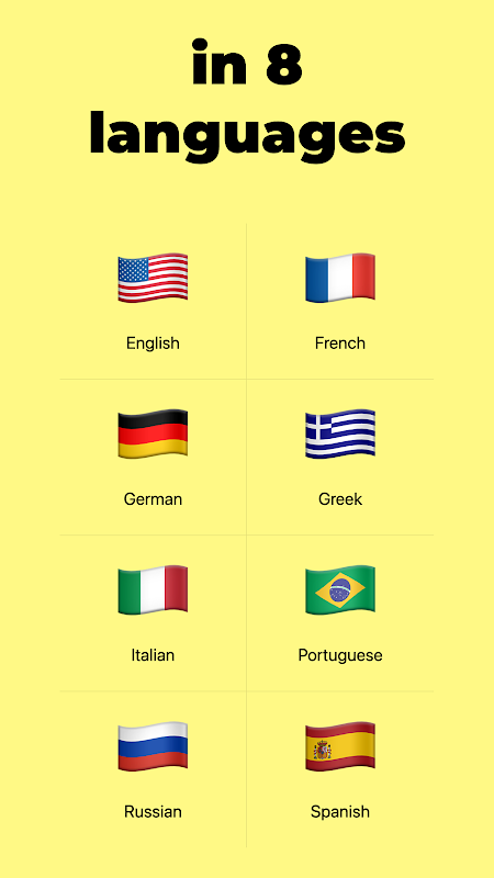 उपलब्ध भाषाएँ: अंग्रेजी, फ्रेंच, जर्मन, इतालवी, रूसी, स्पेनिश, ग्रीक, पुर्तगाली।
