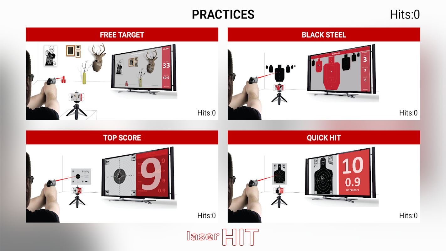 - LaserHIT एप्लिकेशन वास्तविक समय में पेपर लक्ष्य पर हिट दर्ज करेगा और अपने स्मार्टफोन स्क्रीन पर शॉट परिणाम प्रदर्शित करेगा।