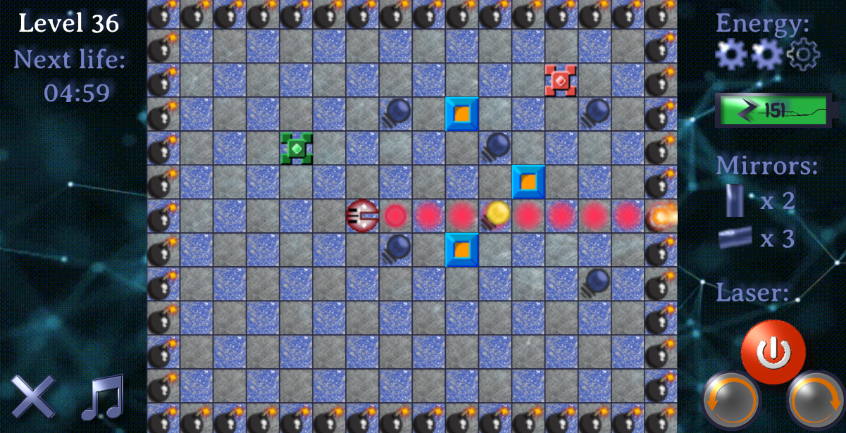In this 2D puzzle game you're an experimental physicsts and its on you to build up an setup to activate all the lamps on the table by hitting the with a laser beam. Unfortunately, they are distributed over the whole map. Hence, you have to place different type of mirrors at the correct spots on the map in order to redirect the laser beam and hit the lamps. But since this alone would be too easy, different kind of objects like bombs, gates and blocks make this whole process a way more difficult, so you have to think twice (or more) before you activate the laser...