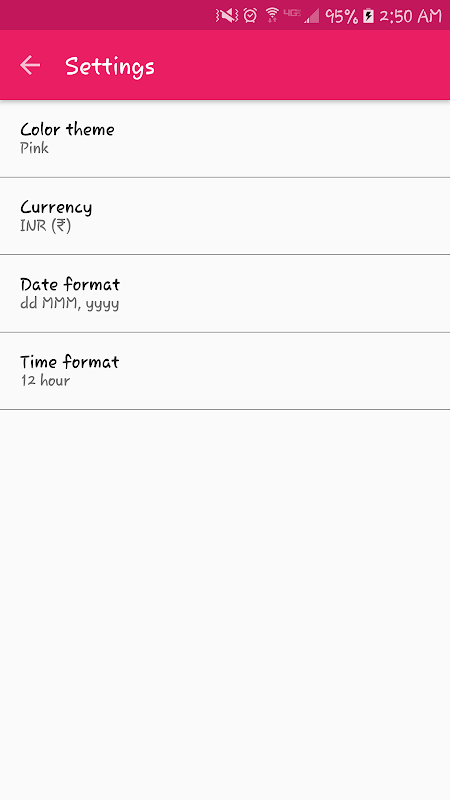 - रंग विषय, तिथि / समय प्रारूप, अनुस्मारक विकल्प और मुद्रा बदलने