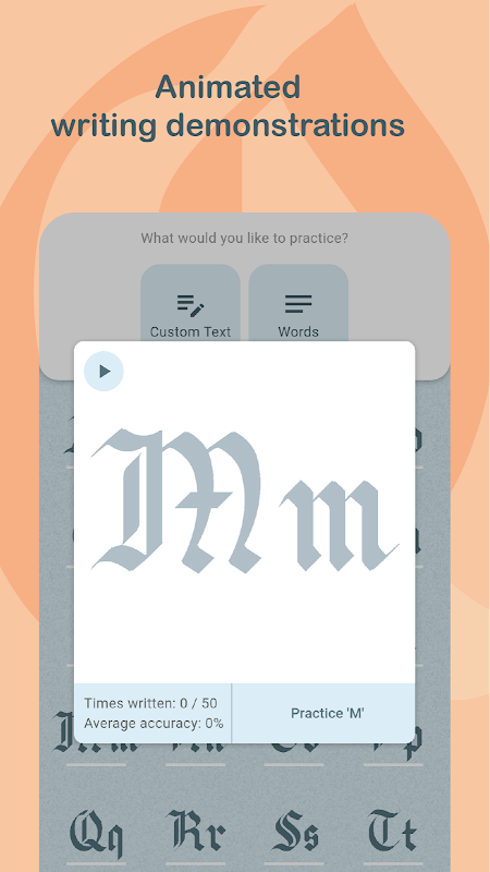 ऐप में अक्षरों को ट्रेस करें या कागज पर अभ्यास करते समय एक गाइड के रूप में एनिमेटेड प्रदर्शनों का उपयोग करें।