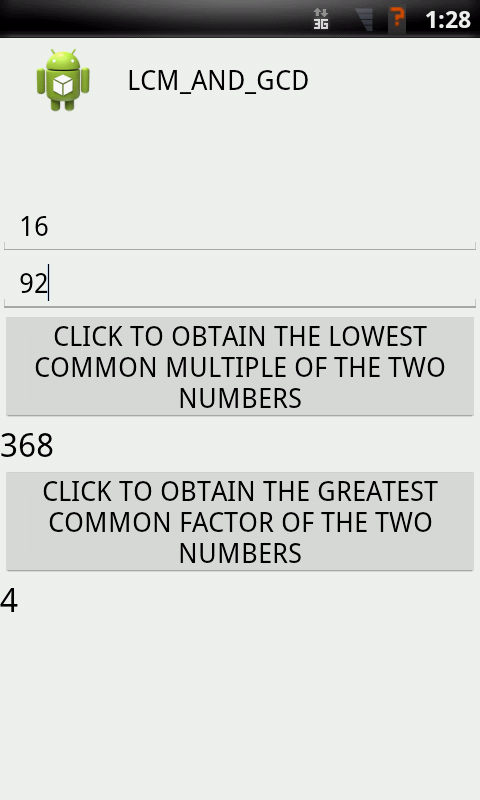 2 नंबर की सबसे कम आम एकाधिक और सबसे बड़ा आम कारक खोजने के लिए एप्लिकेशन