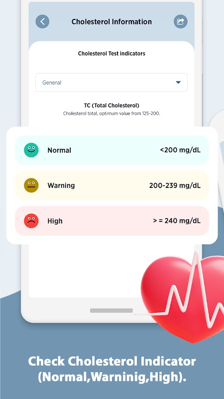 व्यक्तिगत स्वास्थ्य संकेतक: अपने डैशबोर्ड पर अपने कोलेस्ट्रॉल की स्थिति को सामान्य, चेतावनी या उच्च के रूप में स्पष्ट रूप से चिह्नित देखें।
