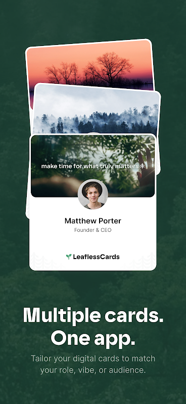 विभिन्न भूमिकाओं या व्यवसायों के लिए कई कस्टमाइज़ करने योग्य डिजिटल कार्ड बनाएँ। अपना नंबर, ईमेल या पदनाम कभी भी अपडेट करें - आपके संपर्कों को तुरंत अपडेट किया गया वर्ज़न दिखाई देगा। अब पुरानी जानकारी, खोए हुए कार्ड या मैन्युअल संपादन की ज़रूरत नहीं। लीफलेस कार्ड्स आपकी पेशेवर पहचान को गतिशील और सिंक्रोनाइज़ रखता है।