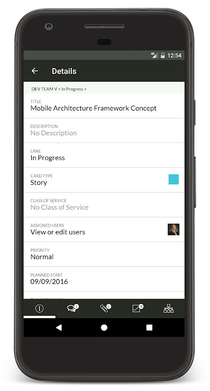 • Tap cards to view and edit details, including comments, lane status, deadlines and attachments