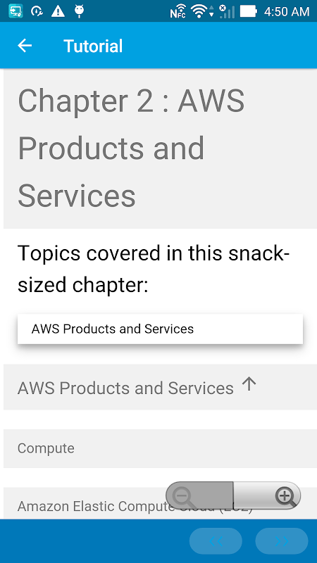 You have limited access to the content provided. For full access to the content, please login and purchase this application. This app provides a quick summary of essential concepts in Amazon Web Services by following snack sized chapters: