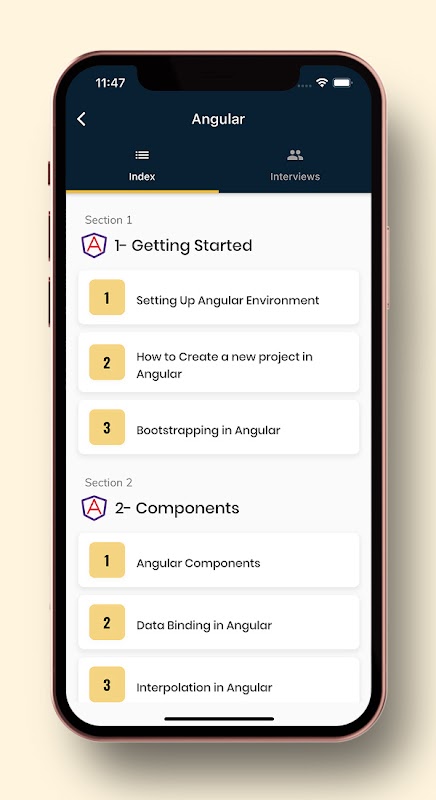 यह नौकरी के लिए तैयार कोणीय डेवलपर बनने के लिए पूर्ण मुक्त मार्ग है। इस ऐप में आप कोड उदाहरण और साक्षात्कार प्रश्न के साथ कोणीय और कई संबंधित टेक्नोलॉजीज को सीखेंगे और मास्टर करेंगे। यह ऐप सभी मूल विषयों को कवर करेगा जैसे कि हम HTML, सीएसएस और जावास्क्रिप्ट जैसी बुनियादी बातों से शुरू करेंगे, फिर हम स्वयं कोणीय पर आगे बढ़ेंगे।