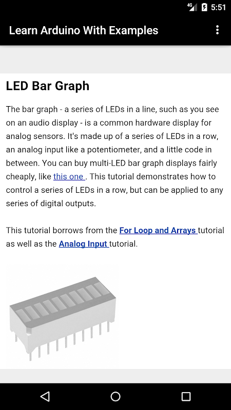 Learn Arduino With Examples app teaches you basic concepts about Arduino using suitable examples. Arduino consists of both a physical programmable circuit board as well as a software, or IDE (Integrated Development Environment) that runs on your computer, which can be used to write & upload computer code to the physical board.