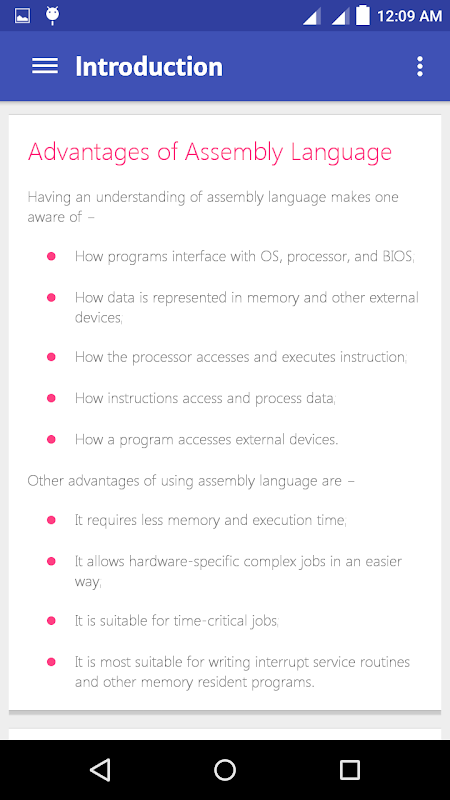 This application is also made in a manner to help out all the students who wish to study Assembly Language on a go with a pocket sized Assembly Language book in your smart phone.