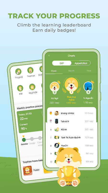 - वैयक्तिकृत फीडबैक के साथ अनुकूली शिक्षण चीनी बोलने में आपकी सटीकता और आत्मविश्वास में सुधार करता है।