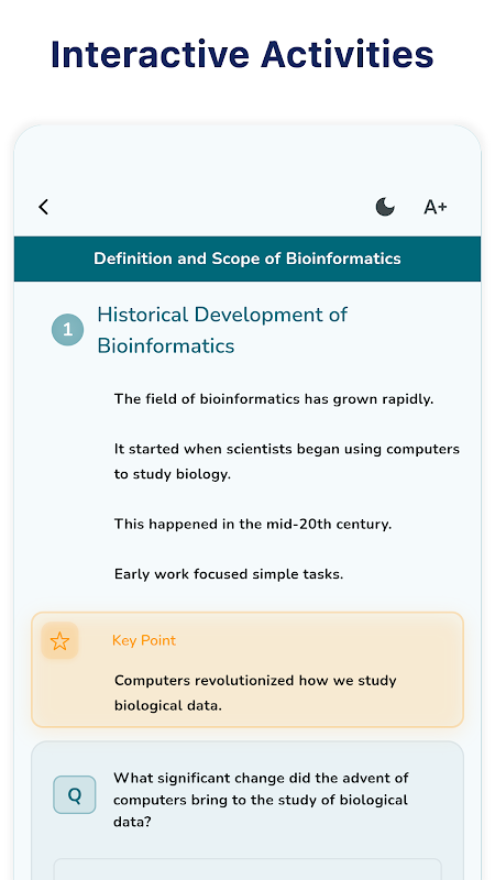 • शुरुआती लोगों के लिए अनुकूल भाषा: स्पष्ट, सरलीकृत पाठ के साथ जटिल जैव सूचना विज्ञान अवधारणाओं को आसानी से समझें।