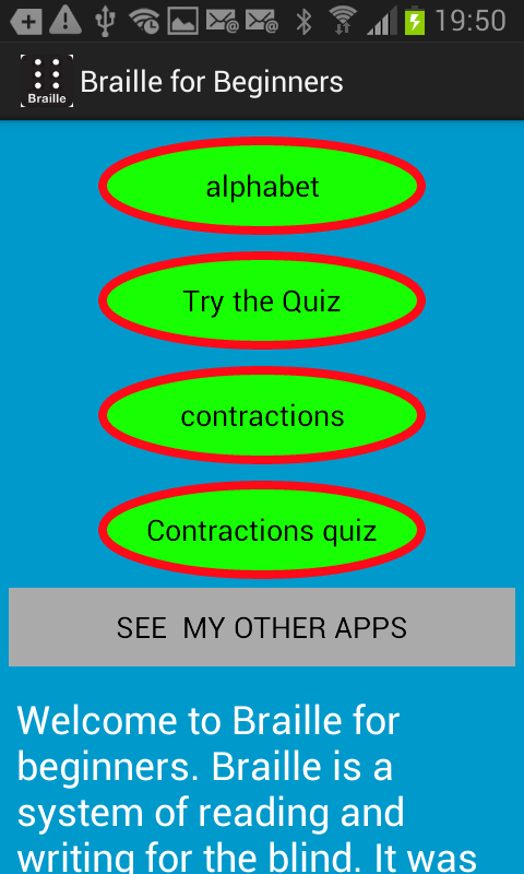 अंधे की लिखित भाषा सीखने में आपकी मदद करने के लिए एक सरल इंटरैक्टिव ऐप।