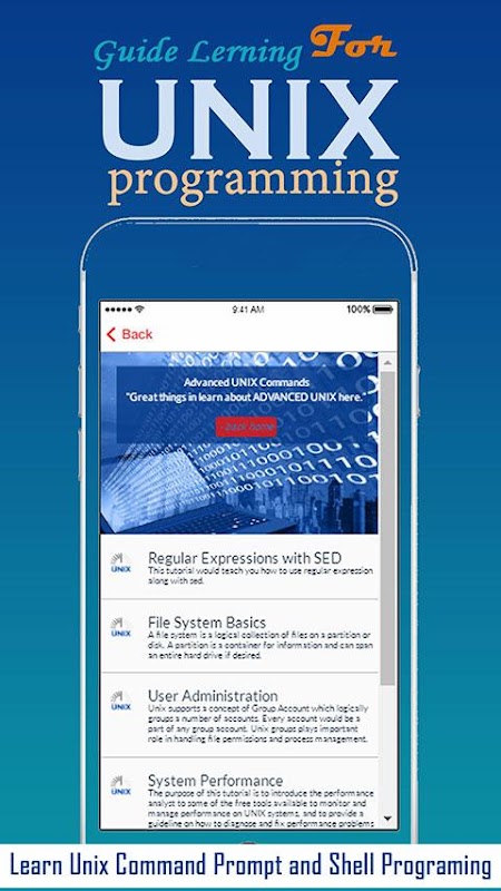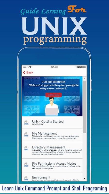 इस एप्लिकेशन को भी खोल प्रोग्रामिंग की बुनियादी रूप में अच्छी तरह से उन्नत बुनियादी बातों में शामिल हैं। यह आपके यूनिक्स ऑपरेटिंग सिस्टम के साथ एक अच्छा समय है करने के लिए ऐप है। यह यूनिक्स से संबंधित अलग अलग बातें जानने के लिए प्रेमी Linex मदद करने के लिए बनाया गया है।