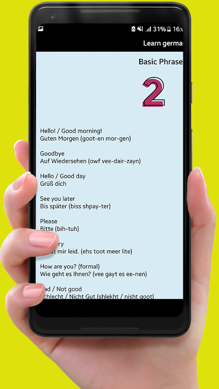 If you are trying to learn how to speak and read German this education app for you. You learn through a variety of topics: Greetings, Introductions, Frequent sentences, Directions, Weather, Doctor, Market, Numbers, Problem, Transportation, Question, Feelings, Hotel, Shopping, Restaurant, Time, Date, Sports, Colors, Animals, Body, Travel and nature, School, Astrology, Interview, Car, Work.