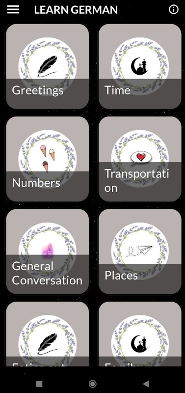 Aplikasi ini berisi alphabet yang lengkap, greetings, percakapan sehari-hari yang sering kita gunakan, angka dalam bahasa Jerman, dan banyak pengetahuan yang bisa kalian dapat dari sini.