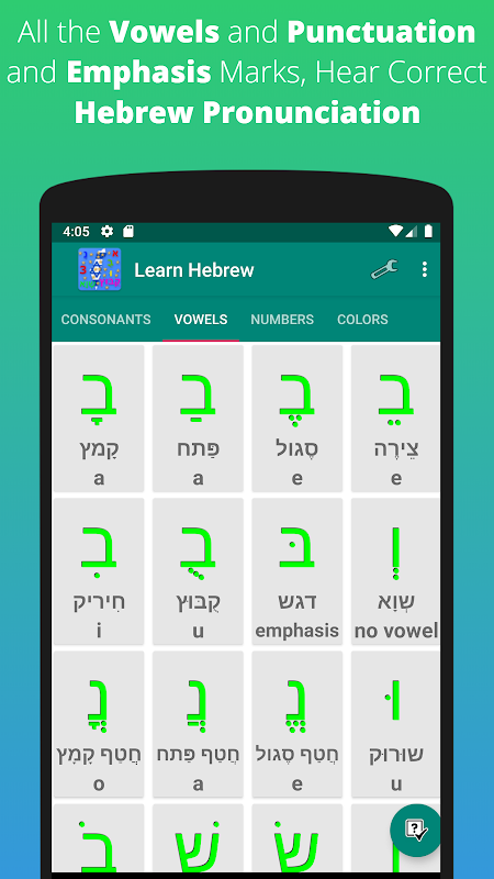नि: शुल्क, आसान और मज़ा हिब्रू वर्णमाला जानें - व्यंजन, स्वर, संख्या और रंग