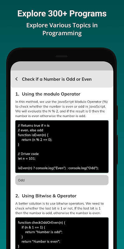 जावास्क्रिप्ट प्रोग्रामिंग सीखने का सबसे अच्छा तरीका उदाहरणों का अभ्यास करना, प्रश्नों को हल करना और क्विज़ लेना है। अभ्यास के माध्यम से जावास्क्रिप्ट सीखना प्रोग्रामिंग में शीघ्रता से महारत हासिल करने का एक आसान और प्रभावी तरीका है। इस ऐप में, प्रत्येक विषय में अद्वितीय आउटपुट के साथ इसके उदाहरण शामिल हैं, जो आपको जावास्क्रिप्ट को अधिक प्रभावी ढंग से सीखने में मदद करते हैं।