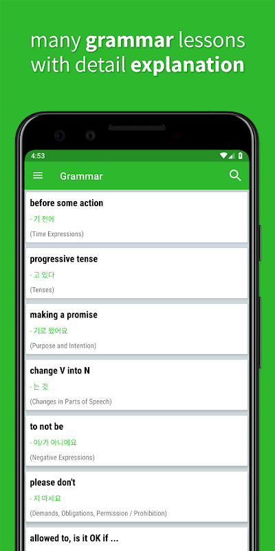 - कोरियाई निशुल्क ऑफ़लाइन सीखें 18 श्रेणियों में 1000 से अधिक आमतौर पर उपयोग किए जाने वाले कोरियाई वाक्यांश और शब्दावली शामिल हैं: