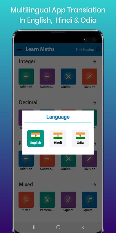Learn Maths123 is an excellent mobile application for preschool and grade school kids to learn basic arithmetic ideas like Addition, Subtraction, Multiplication, Division, Decimals, Fractions, pure mathematics and so on. This app create a better result for learning ability through practice of mental maths. Its like a Mental Math game which will enhance the brain. It is a multilingual app with two major language such as English, Hindi and one regional language such as Odia widely used across the country.