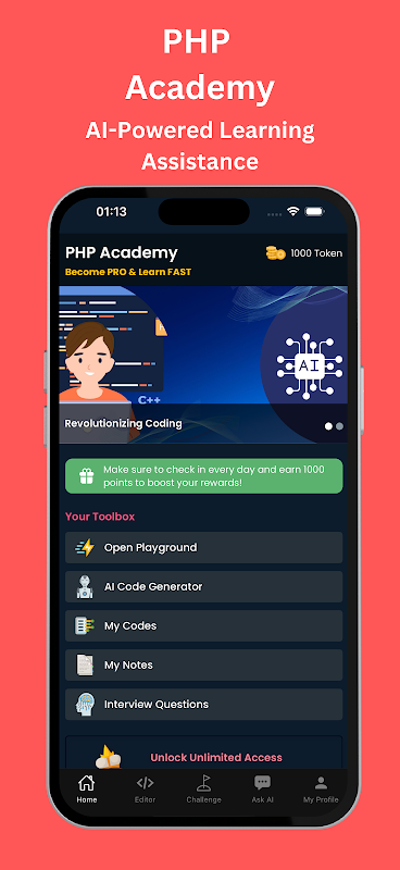 त्वरित सहायता के लिए एआई चैटबॉट: ऐप में एक एआई-संचालित चैटबॉट शामिल है जो आपके सभी PHP-संबंधित प्रश्नों का उत्तर दे सकता है। चाहे आपको किसी विषय पर स्पष्टीकरण की आवश्यकता हो, डिबगिंग कोड में सहायता की आवश्यकता हो, या एक नई PHP अवधारणा सीखना हो, चैटबॉट किसी भी समय आपकी सहायता के लिए मौजूद है।