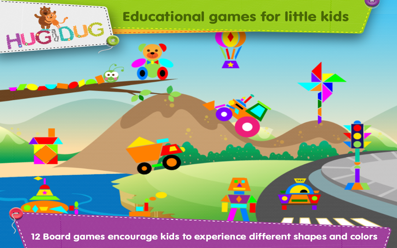 By matching shapes and colors, kids create real animated puzzles. Fly the air balloon, take a journey underwater with the submarine or build a house for Hug and Dug.