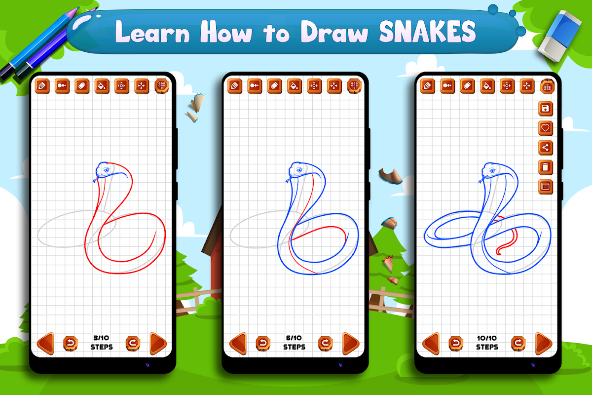 Learn to Draw Snakes is perfect app for those who want to be an artist and love drawing reptile animals. This App teaches you how to draw cute kawaii snakes in simple steps and improve your confidence of drawing and coloring.