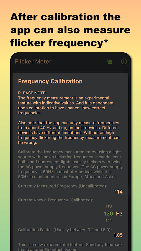 यह ऐप प्रकाश की टिमटिमाहट को मापता है जो इतनी तेज़ी से टिमटिमाती/चमकती है कि हम आमतौर पर इसे अपनी आँखों से नहीं देख पाते हैं। लेकिन यह अभी भी हम पर नकारात्मक प्रभाव डाल सकता है - टिमटिमाती रोशनी के परिणाम के रूप में आंखों पर तनाव, सिरदर्द, माइग्रेन और यहां तक कि मिर्गी के दौरे की सूचना मिलती है। इस ऐप से आप माप सकते हैं कि आपके एलईडी लैंप, एलईडी बल्ब, फ्लोरोसेंट ट्यूब लाइट और स्क्रीन टिमटिमा रहे हैं या नहीं।