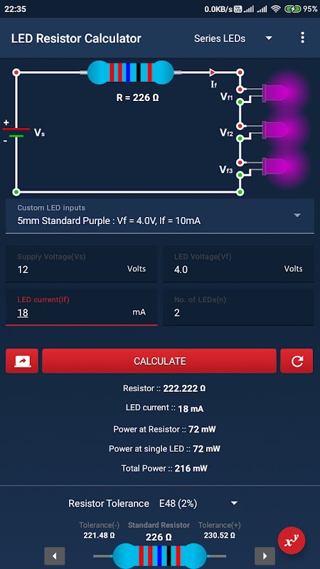 श्रृंखला या समानांतर में जुड़े एकल या एकाधिक एल ई डी से प्रतिरोधी का मान ज्ञात करें।