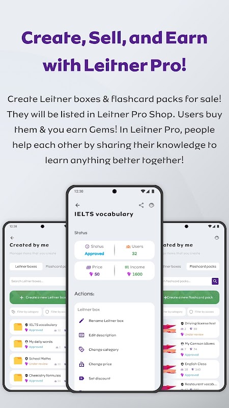 आपके द्वारा बनाए गए लीटनर बॉक्स और फ्लैशकार्ड पैक बेचकर रत्न अर्जित करने की क्षमता