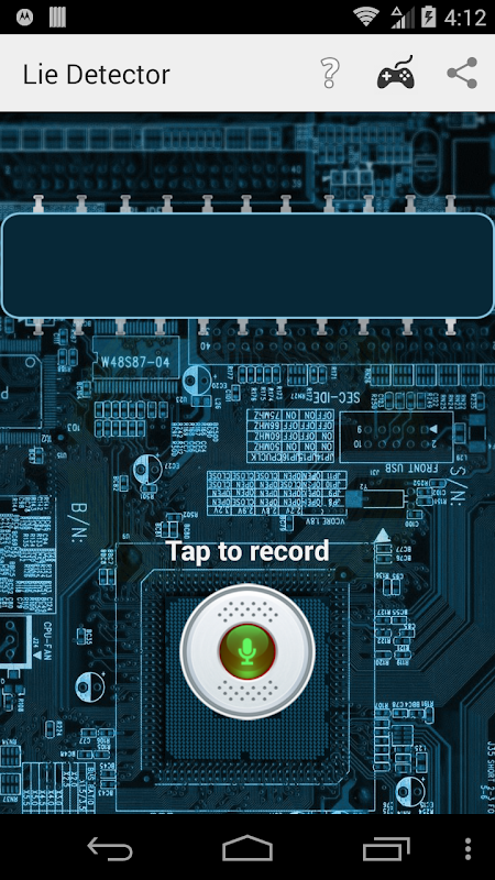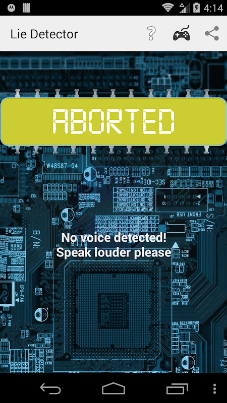 इससे आप अपने दोस्तों, परिवार, बच्चों के लिए खेल सकते हैं एक मजेदार खेल है, आदि यह व्यक्ति झूठ बोल रहा है या सच कह रहा है कि अगर यह पता लगाने के लिए एक आवाज स्कैनर simulates है। आप ऊपर या नीचे मात्रा बटन दबाने से एक जवाब के लिए मजबूर कर सकते हैं।
