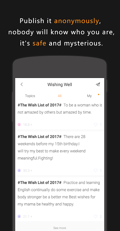 Everyone has a secret place deeply inside, has various ideas what to express but doesn't want others to know.Publish it anonymously, nobody will know who you are, it's safe and mysterious.