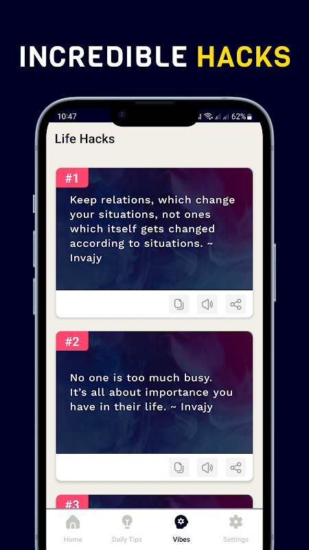 लाइफ हैक्स टिप्स और ट्रिक्स ऐप का उपयोग करके आप अपने जीवन को आसान और खुशहाल बना सकते हैं। इन जीवन युक्तियों के साथ, आप समय की बाल्टियों को बचाने के लिए बहुत सारे ज्ञान और तरकीबें सीख सकते हैं। मुझे पूरा यकीन है कि आपको यह ऐप बहुत मददगार लगेगा और आप अपने दोस्तों और परिवार के सदस्यों के साथ हर दिन के लाइफ हैक्स भी शेयर करेंगे।