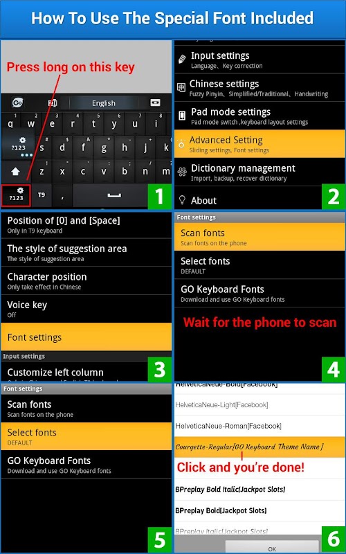 - कस्टम फ़ॉन्ट का उपयोग करने के लिए 'लंबे कुंजी पर प्रेस शामिल? 123 उन्नत सेटिंग 'अनुभाग, तो' स्कैन इच्छा 'से' फ़ॉन्ट सेटिंग 'और चुनें' 'और साथ जुड़े फ़ॉन्ट का चयन' लौ कुंजीपटल '. अधिक जानकारी के लिए अंतिम प्रस्तुति / स्क्रीनशॉट देखें.