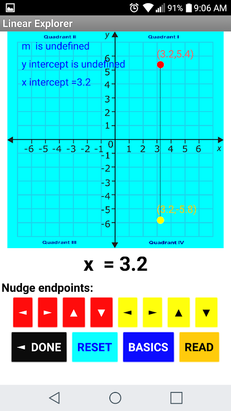 Change the graph by dragging the red or yellow “ball” to move the end points of the line segment. Linear Explorer immediately displays the equation of the resulting line in slope-intercept format.