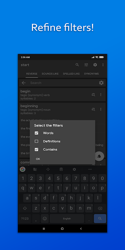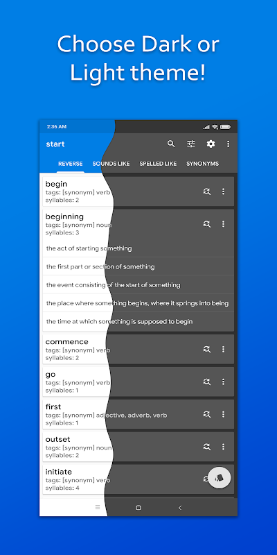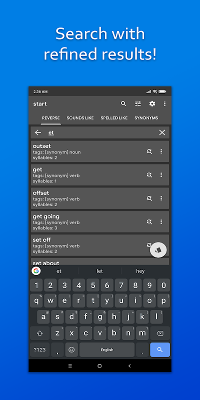 समान, संबंधित और समान लगने वाले शब्दों को खोजने के लिए एक रिवर्स डिक्शनरी ऐप।