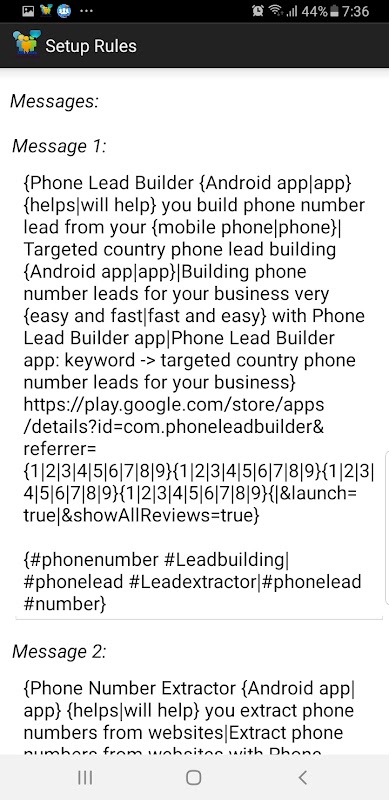 -संदेश आपके पूर्व-निर्धारित संदेशों के बीच बेतरतीब ढंग से चुना जाएगा, और यादृच्छिक स्पिनटैक्स पीढ़ी का उपयोग करेगा।