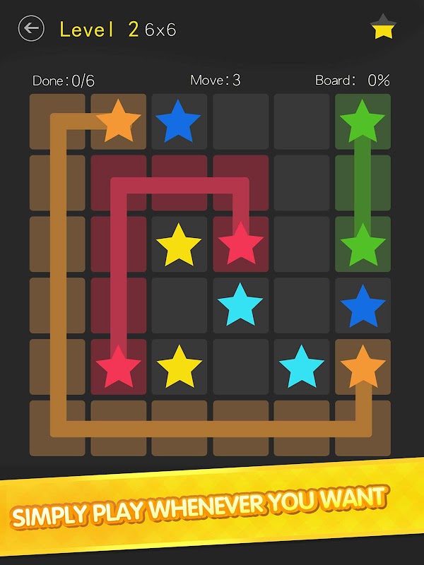 It's really easy to play this game. All you need is using your wisdom and linking stars with the same colour. When all the stars matched, the puzzle is simply solved. But be careful, the lines should not be cross or overlapped.