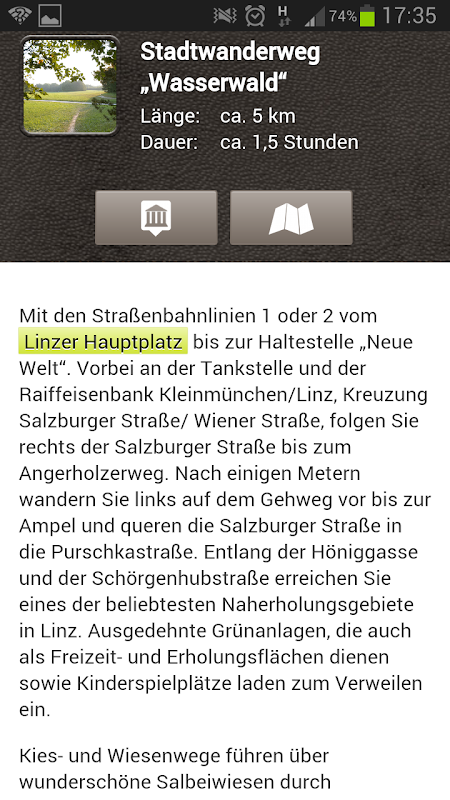 Linz.Wandern beschreibt 10 Stadtwanderwege in Linz. Die Wanderwege sind ausführlich beschrieben und können mit GPS live auf dem Stadtplan mitverfolgt werden. Neben der Wanderroute, dem Höhenprofil, der Länge der Wanderung und geschätzter Dauer sind auch alle Sehenswürdigkeiten und Tipps für eine Rast enthalten.