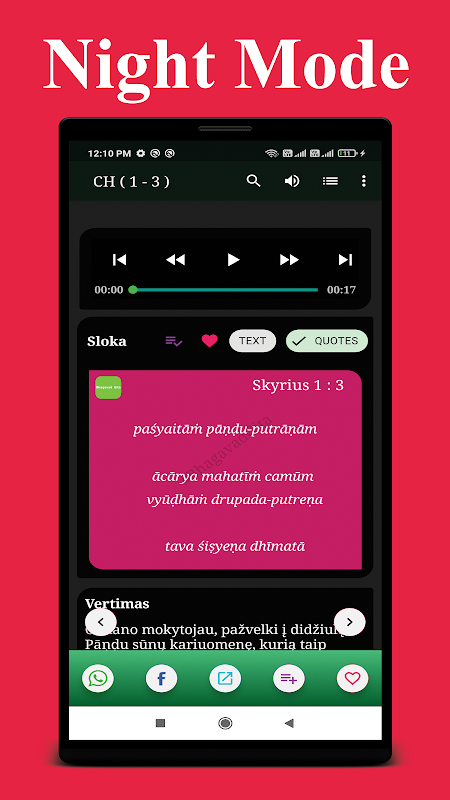 The Apps contains a veriety of material, presented in a manner which is easily accessible: the entire 700 verses of the Lithuanian Bhagavad Gita chapters are in Devanagari with a Lithuanian transliteration, followed by an Lithuanian translation, (ANVAYA the prose order of the Sanskrit words) and word by word meaning. Each verse has been traditionally chanted to illustrate the sound and beauty of the Sanskrit language. In addition, miscellaneous writings and extensively interlinked indexes give much to the scholar to work with. These includes a Quarter-verse Index, a Subject Index, and a Word Index which lists all the words in the Lithuanian Bhagavad Gita alphabetically along with their grammatical analysis. Hundreds of visuals have been used to give each page its own mood and atmosphere, at times bordering on the sublime. Last but certain not the least, it contains the entire text of Sri Aurobindo’s ‘Essays on the Lithuanian Bhagavad Gita ’. You can also understand Bhagavad Gita in Lithuanian . Bhagavad Gita essays in Lithuanian has also been provided.