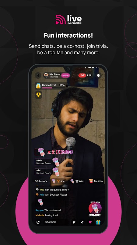 लाइव एवरीव्हेयर एक लाइव स्ट्रीमिंग प्लेटफ़ॉर्म है जो विभिन्न प्रकार की लाइव स्ट्रीमिंग सामग्री परोसता है। लाइव एवरीव्हेयर पर, आप संगीत, गेम, संगीत कार्यक्रम, प्रेरक टॉक शो, कुकिंग शो, पुरस्कारों के साथ क्विज़ से लेकर अपने पसंदीदा सामग्री रचनाकारों या कलाकारों के साथ चैट करने और मौज-मस्ती करने तक विभिन्न प्रकार की लाइव स्ट्रीमिंग सामग्री पा सकते हैं। न केवल लाइव एवरीव्हेयर क्रिएटर कंटेंट से लाइव स्ट्रीमिंग देख रहे हैं, बल्कि आप अपनी खुद की लाइव स्ट्रीम भी बना सकते हैं और प्रसिद्ध हो सकते हैं!