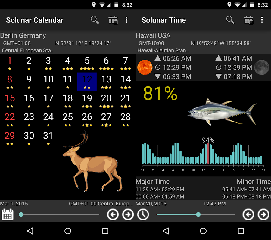 .fishing कैलेंडर, मछली पकड़ने के समय, शिकार समय, Solunar तालिकाओं