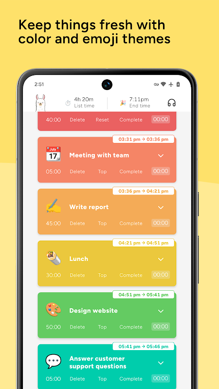 लामा लाइफ आपको आपकी कुल सूची समय और अनुमानित समापन समय भी बताता है, ताकि आप समय बीतने के बारे में अधिक जागरूक हो सकें, और अपने दिन की योजना बना सकें।