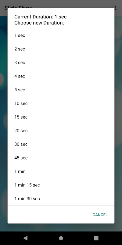 उपयोगकर्ता द्वारा निर्धारित अवधि के बाद यह ऐप एक फ़ोल्डर से चित्र फ़ाइलों को खेलता है: