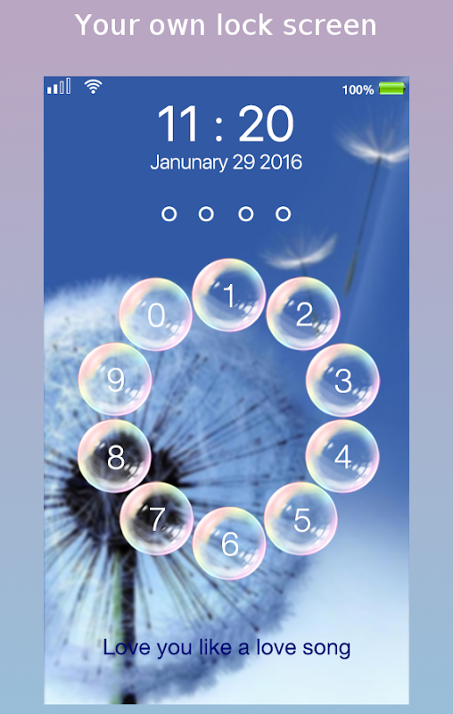 आप कई साबुन के बुलबुले जो एक सर्कल में व्यवस्थित किया गया था के साथ एक कीपैड देखेंगे। तुम भी लॉक स्क्रीन में कुछ custome कर सकते हैं। आप रंग और समय के आकार, तिथि बदल सकते हैं। आप लॉक स्क्रीन की पृष्ठभूमि में परिवर्तन कर सकते हैं। आप अपने खुद के आकर्षक लॉक स्क्रीन होगा।
