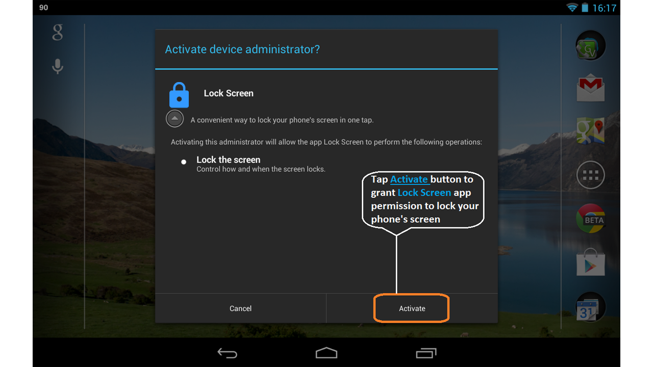 The यह ऐप आपके फोन की स्क्रीन को लॉक करने के लिए डिवाइस एडमिनिस्ट्रेटर की अनुमति का उपयोग करता है।