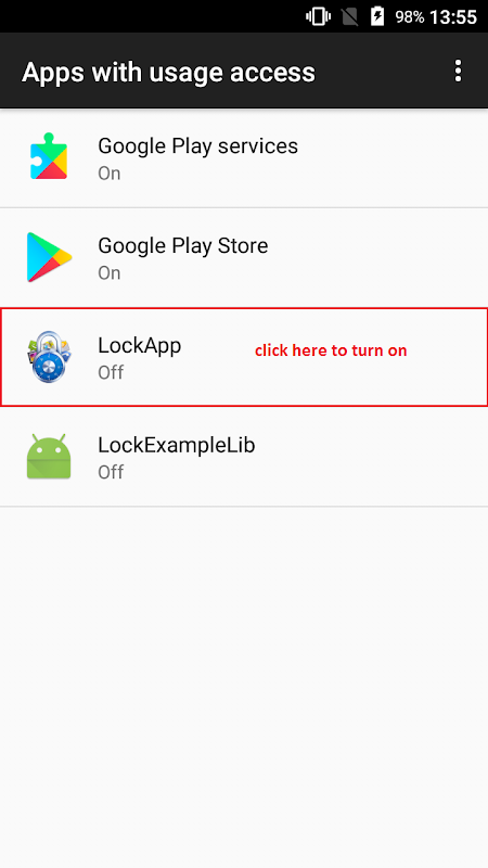 - You need to turn on usage access for lock app (We don't need but this is required by Android Platform)