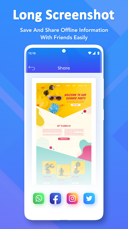 - लंबे स्क्रीनशॉट लें और उन्हें अपने दोस्तों के साथ फेसबुक, मैसेंजर, व्हाट्सएप, इंस्टा या ट्विटर आदि के माध्यम से साझा करें।