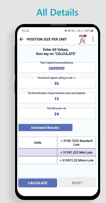 चाहे आप फ़ॉरेक्स पोजीशन आकार की गणना कर रहे हों, अपने पिप मूल्य को समायोजित कर रहे हों, प्रति इकाई पोजीशन आकार का अनुमान लगा रहे हों, या अपने रिवॉर्ड-रिस्क अनुपात की जाँच कर रहे हों, यह ऐप आपकी मदद के लिए है।