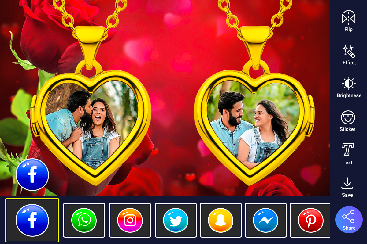 इस अद्भुत ऐप का उपयोग करके अपनी तस्वीरों को संशोधित करें और इसे तुरंत अपने प्रेम साथी, परिवार और अपने दोस्तों के साथ साझा करें। बस गैलरी से चित्र चुनें या कैमरे से चित्र लें, लॉकेट फ्रेम के सुंदर संग्रह से लॉकेट का चयन करें और फ्रेम में दोनों छवियों को तदनुसार समायोजित करें। इसके अलावा युगल तस्वीरों पर सुंदर पाठ जोड़ें और पाठ को समायोजित करें जैसा आप चाहते हैं।