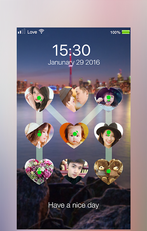 यह एक उपयोगी और अच्छा अनुप्रयोग है। यह आप दिल के आकार पर अपने पसंदीदा चित्र जोड़ सकते हैं, 9 दिल के आकार के साथ एक सुंदर पैटर्न होगा कई options.You साथ अपने लॉक स्क्रीन को अनुकूलित में मदद करता है। आप लॉक स्क्रीन पर दिनांक / समय देख सकते हैं और आप रंग, तिथि / समय का आकार बदल सकते हैं। आप अपने खुद के शब्दों या लॉक स्क्रीन पर कुछ नाम जोड़ सकते हैं।